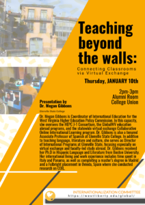 Dr. Megan Gibbons is Coordinator of International Education for the West Virginia Higher Education Policy Commission. In this capacity, she oversees the HEPC J-1 Consortium, the GlobalWV education abroad programs, and the statewide virtual exchange Collaborative Online International Learning program. Dr. Gibbons is also a tenured Associate Professor of Spanish at Glenville State College. In addition to teaching language, literature and culture, she serves as Director of International Programs at Glenville State, focusing especially on virtual exchange and faculty-led study abroad. Dr. Gibbons received her Ph.D in Hispanic Language and Literature from Boston University. Her international living and work experience includes time spent in Italy and Panama, as well as completing a master’s degree in Madrid and a Fulbright placement in Oviedo, Spain where she conducted research on COIL.