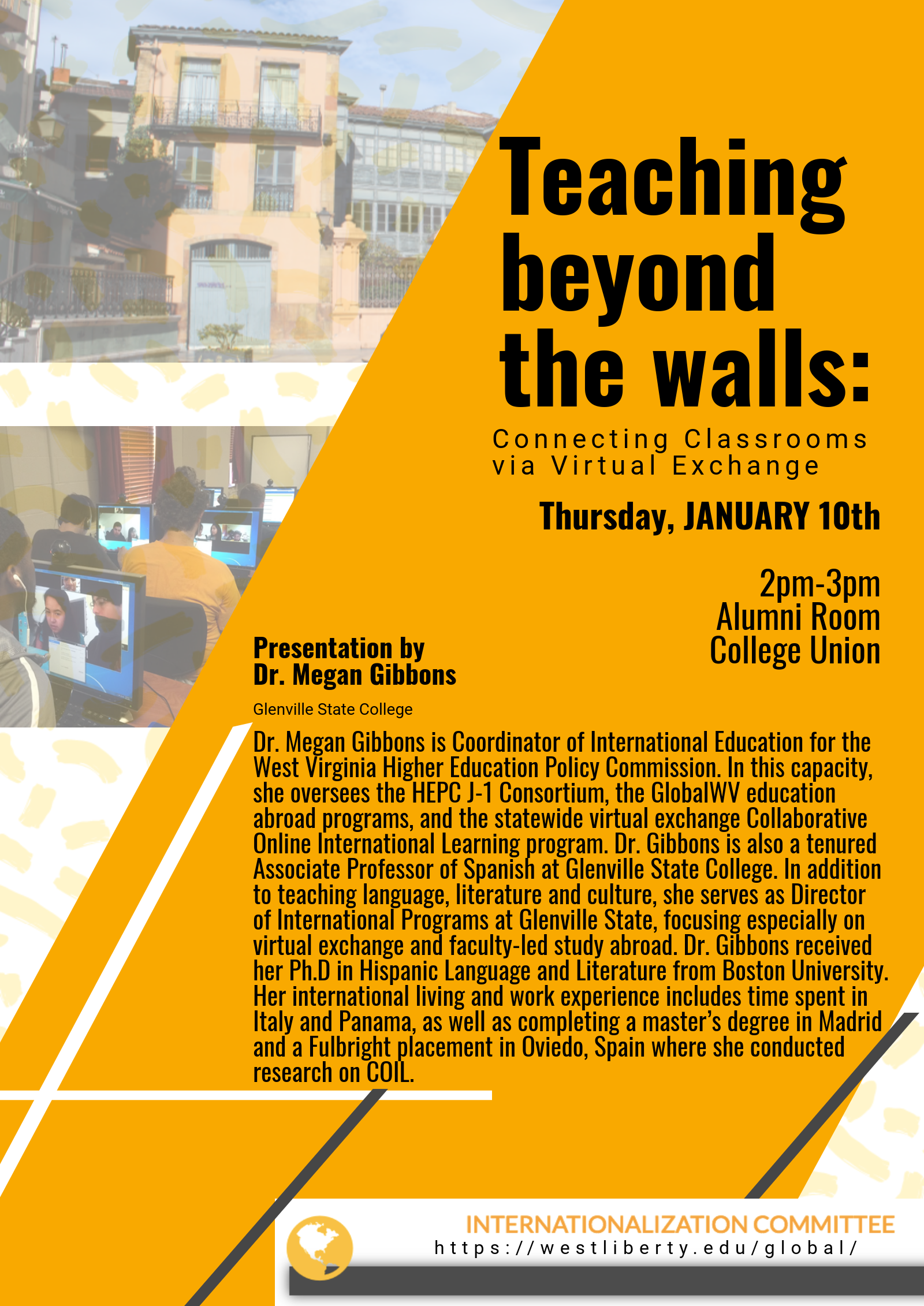 Dr. Megan Gibbons is Coordinator of International Education for the West Virginia Higher Education Policy Commission. In this capacity, she oversees the HEPC J-1 Consortium, the GlobalWV education abroad programs, and the statewide virtual exchange Collaborative Online International Learning program. Dr. Gibbons is also a tenured Associate Professor of Spanish at Glenville State College. In addition to teaching language, literature and culture, she serves as Director of International Programs at Glenville State, focusing especially on virtual exchange and faculty-led study abroad. Dr. Gibbons received her Ph.D in Hispanic Language and Literature from Boston University. Her international living and work experience includes time spent in Italy and Panama, as well as completing a master’s degree in Madrid and a Fulbright placement in Oviedo, Spain where she conducted research on COIL.