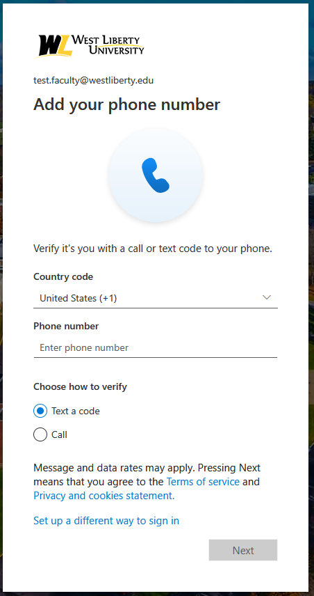 Alternatively, you can enroll in Microsoft MFA using your Phone number. You can receive a code for MFA via text with this method. Simply provide your number and the portal will send a code.