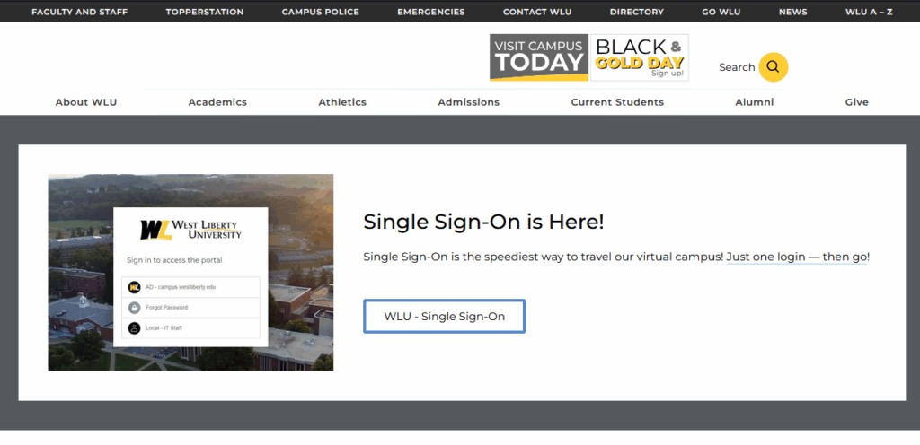 1. To start, navigate to the West Liberty GO WLU page. From the main webpage it can be found at the top of the page in the gray bar. GO WLU can also be accessed by going directly to