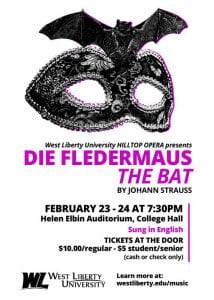 WEST LIBERTY, W.Va., Feb. 15, 2017 — Die Fledermaus by Johann Strauss, Jr., will be performed by West Liberty University music students on Feb. 23 and 24. The opera will Read More
