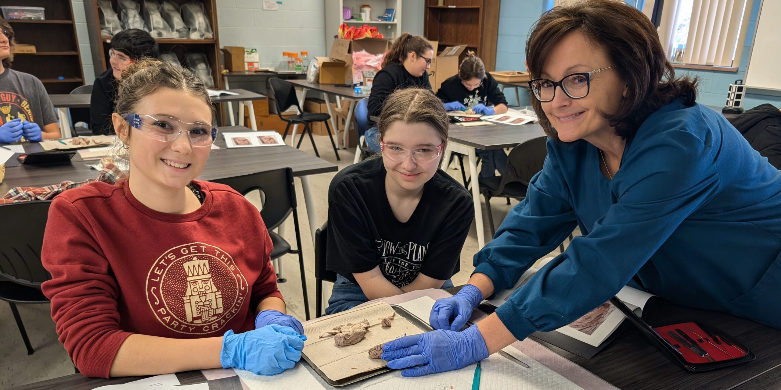 Hosted by Dr. Leslie Quinn, Associate Professor of Biological Sciences, the program allowed students to explore the nervous systems of humans and animals through guided dissections of sheep brains and cow eyes. Students also examined detailed human anatomical models to better understand structural similarities and differences across species.