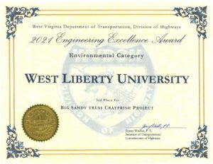 WEST LIBERTY, W.Va., Dec. 9, 2021 — Professor Zachary Loughman’s crayfish lab students have reason to be proud of their work. The group received third place honors for the 2021 Engineering Excellence Award from the West Virginia Department of Transportation, Division of Highways recently.