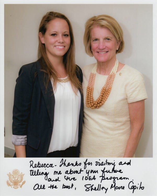 WEST LIBERTY, W.Va., Sept. 9, 2016 — Recent graduate Rebecca Barnes had a chance to meet Senator Shelly Moore Capito over the summer as she was selected to represent WLU at Take Your IDeA Science to Capitol Hill.